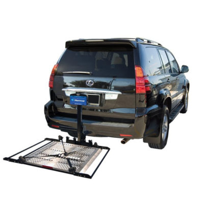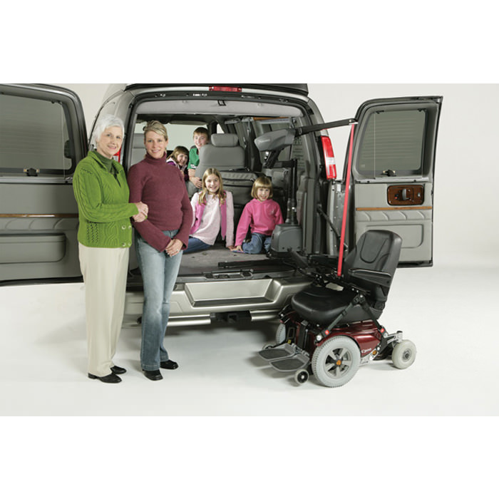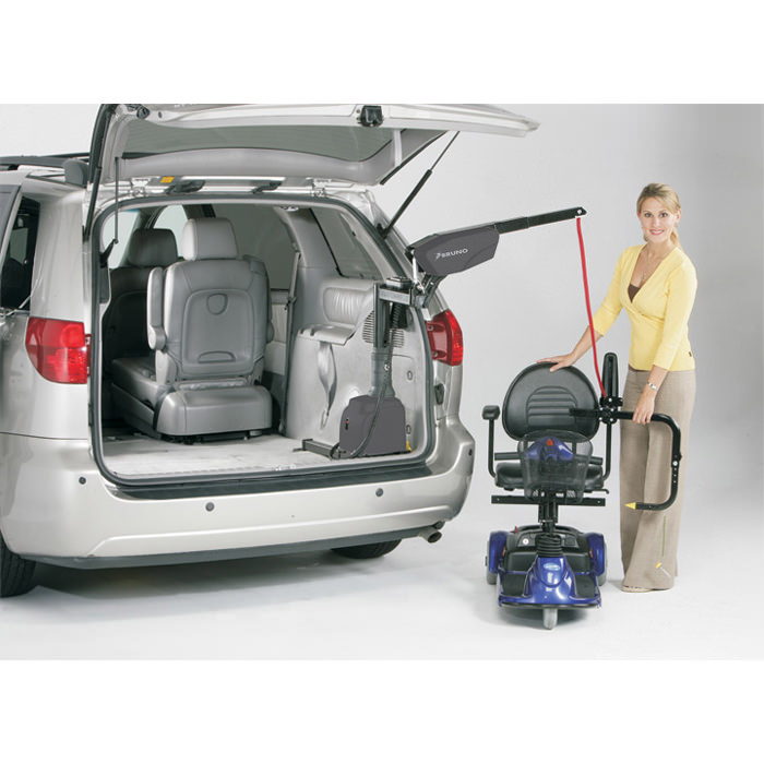 Bruno VSL-6900 Curb-Sider® vehicle lift’s offset arm design allows lifting/lowering behind, at the rear corner of, or on the side of the vehicle and the powered telescoping lift head extends to clear vehicle bumper, then retracts to fit mobility device inside vehicle.