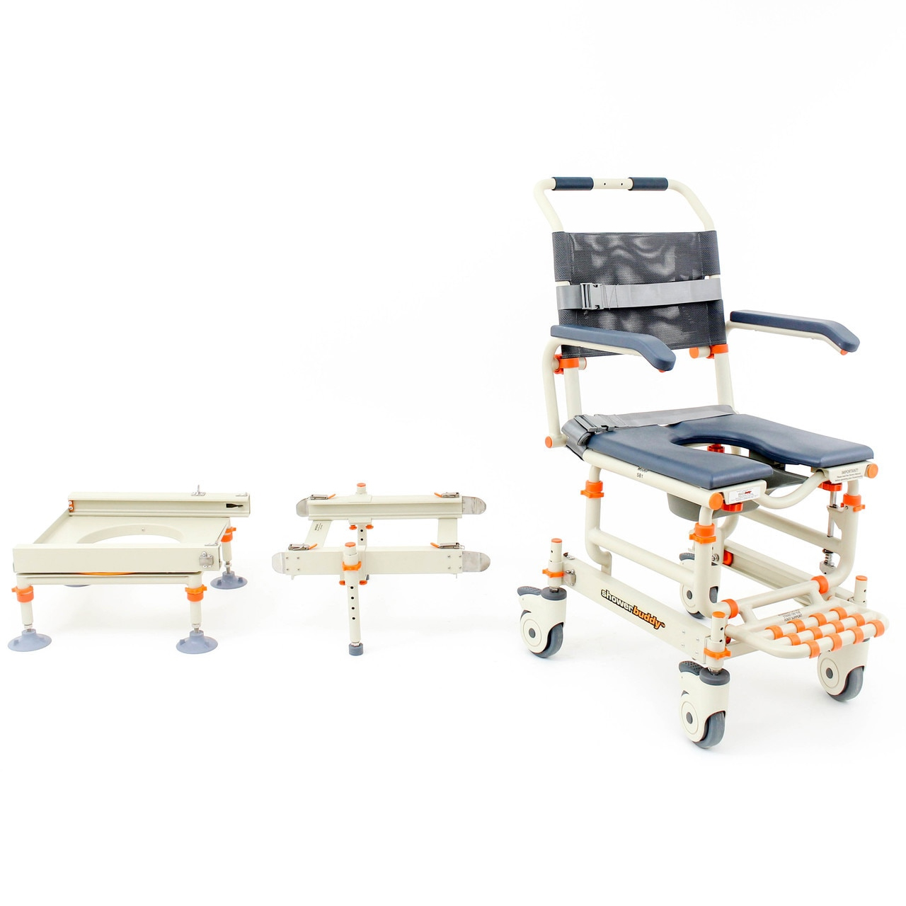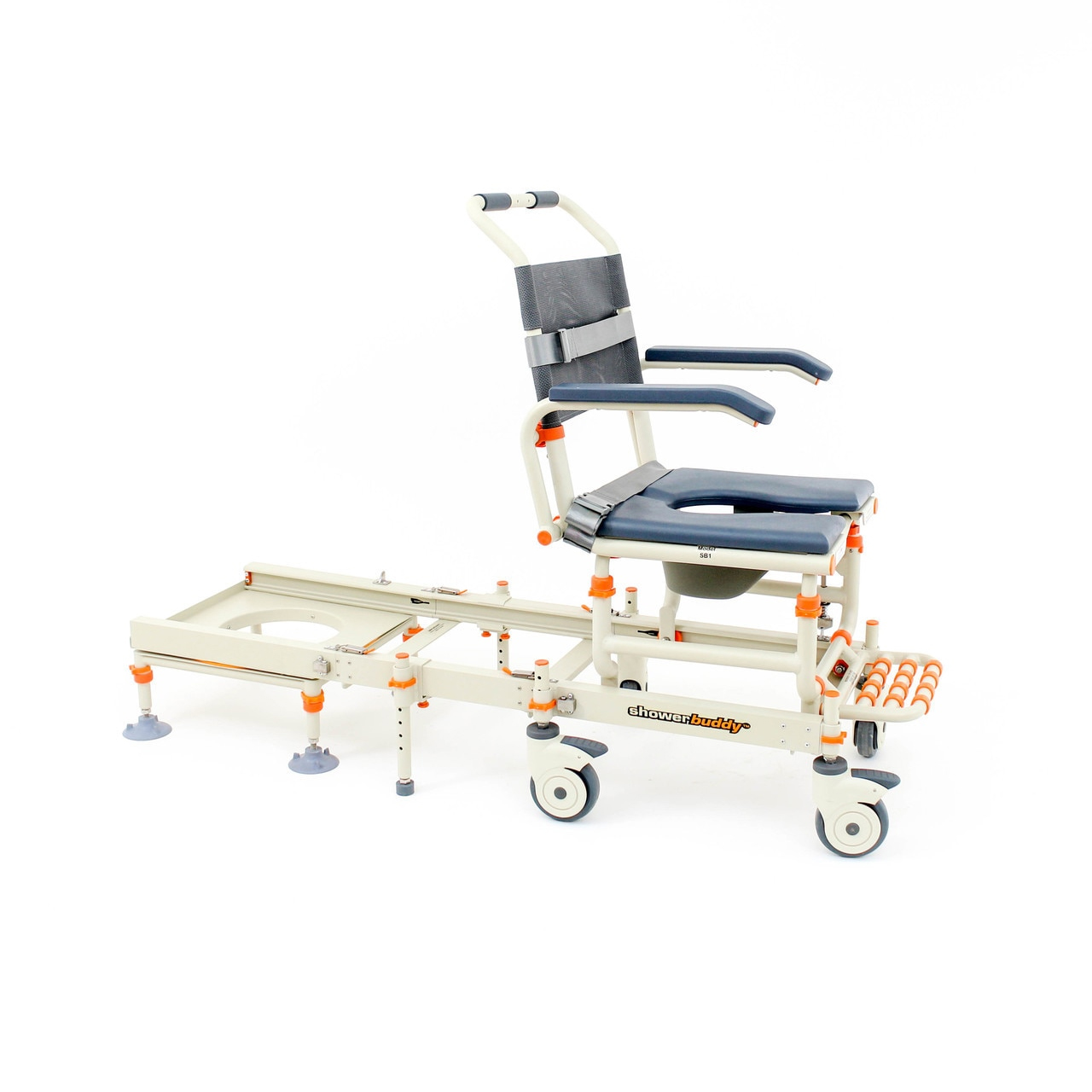 The ShowerBuddy SB1 shower transfer system is a remodel alleviating heavy lifting and multiple transfers for toileting and showering. This chair is separated into three sections; rolling base (shower chair), bridge and shower base. The rolling base rolls around the house like a wheelchair allowing patient to easily transfer and then roll right over a toilet (certain toilets). Once completed with toileting the rolling base can connect to the bridge and then onto the shower base allowing the chair to slide into the shower. Once inside the shower, the bridge disconnects and the shower base turns allowing the user to face the shower controls.